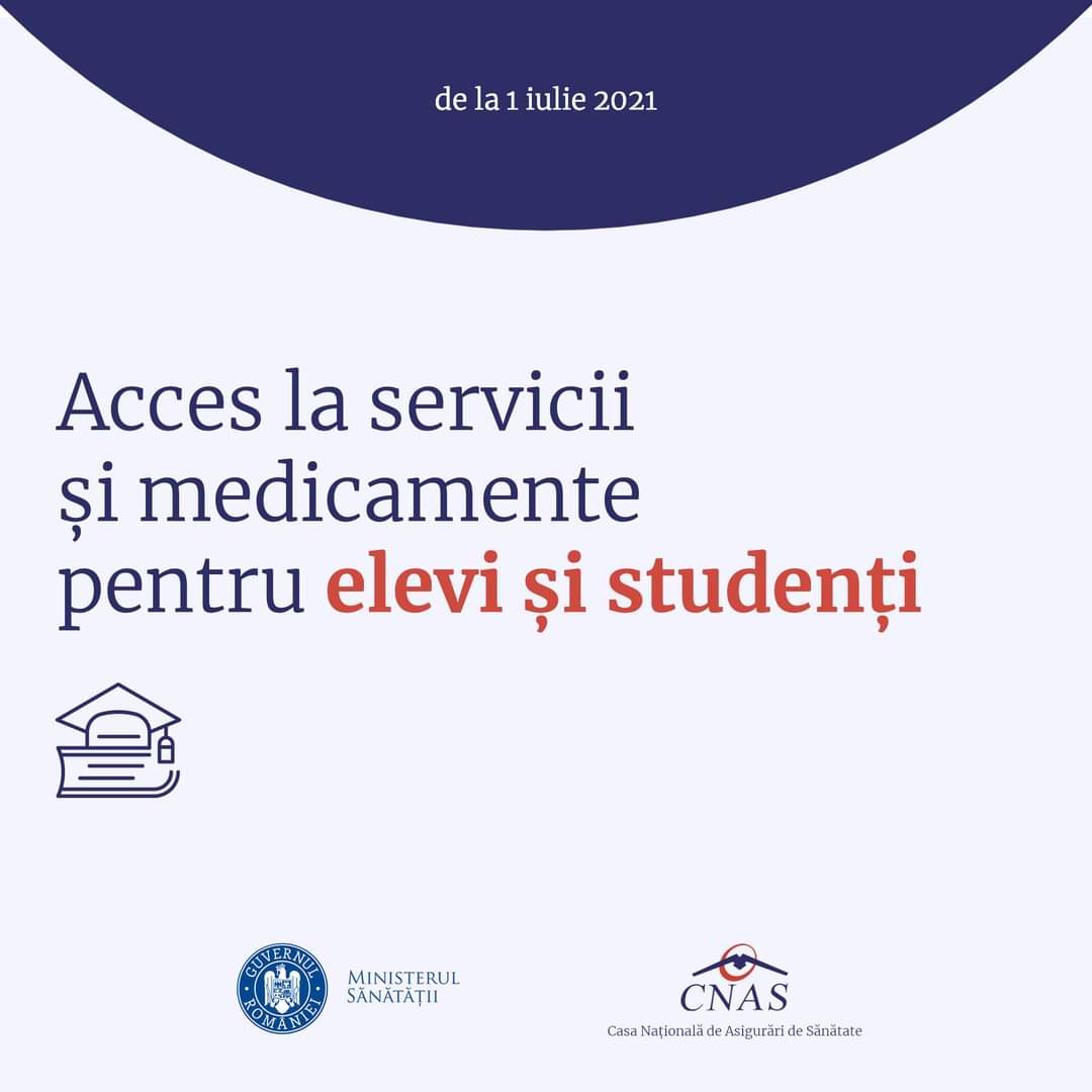 „Începând cu data de 1 iulie 2021, elevii și studenții, indiferent de localitatea de domiciliu a acestora, pot beneficia de următoarele servicii acordate de medicii din cabinetele medicale școlare/ studențești: