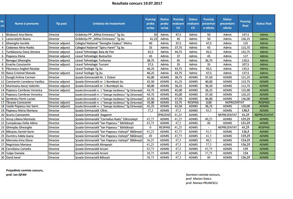 Concursul pentru postul de director al Școlii Gimnaziale George Uscătescu din Târgu-Cărbunești a fost câștigat de Florin Lucian Șendroiu, cel care a condus instituția după plecarea primarului Dănuț Birău. Acesta a obținut 136 de puncte. La examen a participat și Cambrea Veronica Popescu, care a obținut 126, 25 de puncte. Aceasta va ocupa postul de director adjunct, pentru care au susținut examen alți doi candidați. Aceștia pot depune contestație în 48 de ore, dacă sunt nemulțumiți de rezultat. Este declarat „promovat” la concurs candidatul „admis” care a obţinut cel mai mare punctaj total. ”Mi-am propus, în primul rând, să continui ce am început și să aducem școala acolo unde îi este locul, pentru că noi am avut și rezultate foarte bune. La matematică, și anul acesta, cât și anul trecut, am avut medalie de bronz la Olimpiada Națională, un elev al meu a participat. Și la Educație Fizică avem competiții sportive, rezultate foarte bune avem la limba română, la engleză. Cadrele didactice sunt foarte bine pregătite. Avem în derulare un proiect pentru un corp, o clădire, cu patru săli de clasă, vrem să facem laboratoare, pentru că aici suferă școala noastră, laborator de fizică, de chimie, de biologie, informatică. Școala noastră a fost reabilitată acum cinci ani și vechile laboratoare au fost făcute săli de clasă. Funcționau și ca laboratoare”, a declarat pentru Gorjeanul, Dlorin Lucian Șendroiu, directorul Școlii Gimnaziale George Uscătescu din Târgu-Cărbunești. Pe site-ul Ministerului Dezvoltării Regionale, Administraţiei Publice şi Fondurilor Europene s-a publicat lista obiectivelor de investiţii şi sumele alocate acestora pentru finanţarea Programului Naţional de Dezvoltare Locală, în perioada 2017-2020. Pentru construcția unui corp de clădire, la Școala Gimnazială George Uscătescu, s-a acordat suma de 4,771,514.24 de lei.
