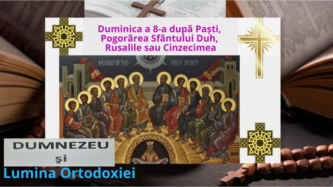 În Duminica a 8-a după Paşti, numită în popor şi Duminica Mare: (+) Pogorârea Sfântului Duh (Cincizecimea sau Rusaliile. Lăsatul secului pentru Postul Sfinţilor Apostoli); Toate ale praznicului; Ap. Fapte 2, 1-11; Ev. Ioan 7, 17-53; 8, 12; iar, Luni, 24 iunie (+) Sfânta Treime, numită şi Lunea Sfântului Duh; (+) Naşterea Sf. Proroc Ioan Botezătorul (Sânzienele sau Drăgaica); (Începutul Postului Sfinţilor Apostoli), deci, în două zile binecuvântate de către Bunul Dumnezeu, avem trei mari sărbători ale lumii creştine, ca o dovadă de netăgăduit că Domnul nostru Iisus Hristos a semănat sămânţă de sfinţenie în viaţa lumii acesteia şi trebuia să vină puterea Sfântului Duh, ca să-i dea căldură şi lumină şi să o facă să trăiască în pace! În acest fel, Dumnezeu Fiul a semănat Pomul Vieţii în câmpurile aride şi neroditoare ale morţii, iar, fâlfâitul zborului Duhului Sfânt să întemeieze acest Pom al Vieţii. În acest fel, putem înţelege că prin înţelepciunea nepătrunsă a Lui Dumnezeu de dinaintea veşniciei se făcuse loc de odihnă al sufletelor alese ale oamenilor! Numai puterea şi înţelepciunea Duhului lui Dumnezeu trebuia să pogoare în acest sălaş şi să-l sfinţească, iar, Duhul bucuriei veşnice trebuia să pogoare ca să unească cerul şi pământul cu un inel care să înveşmânteze Mireasa în haină de nuntă aleasă! Deci, toate urmau să se întâmple, aşa cum au fost proorocite, fiindcă Duhul Sfânt a fost făgăduit şi Duhul Sfânt a venit, şi numai Fiul Lui Dumnezeu putea să făgăduiască venirea pe pământ a Duhului mântuitor, El fiind Cel Care ştia că Duhul va veni, pentru a face grabnică ascultare Celui Unuia faţă de care El are iubire desăvârşită, iar, noi, să putem rosti din tot sufletul nostru, cu evlavie şi cu aleasă credinţă: „Doamne, Cel ce pe Preasfântul Tău Duh în ceasul al treilea L-ai trimis Apostolilor Tăi, pe Acela, Bunule, nu-l lua de la noi, ci, ni-L înnoieşte nouă, cei ce ne rugăm Ţie”!