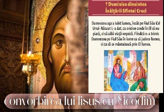 În Duminica dinaintea Înălţării Sfintei Cruci; Ap. Galateni 6, 11-18; Ev. Ioan 3, 13-17 (Convorbirea lui Iisus cu Nicodim); glas 4, voscr. 2, la Sfânta şi Dumnezeiasca Liturghie, textul Sfintei Evanghelii ne readuce în memorie o întâlnire cu totul deosebită dintre Mântuitorul Iisus Hristos şi Nicodim, un fariseu care avea să-I urmeze Mântuitorului şi să-I devină ucenic, astfel că această pericopă evanghelică este desprinsă din discuţia avută de Hristos, la două luni după botezul Său! Nicodim era un fariseu bine intenţionat, membru al Marelui Sinedriu. La vremea aceea, Iisus Hristos Se găsea în Ierusalim pentru sărbătoarea Paştelui în primul an al vieţii Sale publice, iar, lumea cunoscuse deja minunile Sale şi mulţi credeau în El (v. Ioan 2,23). Aşadar, fariseul Nicodim voia să-L vadă de aproape pe Domnul Iisus, însă, duşmanii Lui, fariseii şi ceilalţi, dăduseră poruncă hotărâtă ca oricine crede în El sau vorbeşte public despre El să fie exclus din sinagogă. De aceea şi Nicodim L-a întâlnit pe Hristos pe ascuns, în taină, noaptea, probabil în casa Salomeei, mama lui Ioan, pentru că în întuneric, la lumina lumânărilor, el a văzut Lumina Adevărului şi a spus: ,,Rabi, ştim că de la Dumnezeu ai venit învăţător, fiindcă aceste minuni pe care le faci Tu nimeni nu le poate face dacă Dumnezeu nu este cu el” (Ioan 3, 2), mai ales că Nicodim Îl vedea pe Hristos ca pe un om care pur şi simplu îl avea pe Dumnezeu cu el, şi nu ca pe Însuşi Fiul lui Dumnezeu, adică, Dumnezeu adevărat! Iar Iisus Domnul trebuia să-i arate că era Fiul lui Dumnezeu prin faptul că minunile toate le făcea de unul singur. Dar, ca să nu-l preseze şi să-l facă să se gândească singur, I-a vorbit Domnului ca la o persoană respectabilă, Care spunea: ,,De nu se va naşte cineva de Sus nu va putea să vadă împărăţia lui Dumnezeu (Ioan 3, 3). Iar, Nicodim cel pământesc, atunci când a auzit despre naştere, s-a mirat şi ca un om obişnuit ce era, nu putea face urcuşuri duhovniceşti, motiv pentru care uimit fiind, L-a întrebat pe Hristos: Cum poate omul să se nască, fiind bătrân? Oare poate el să intre a doua oară în pântecele mamei sale şi să se nască? (Ioan 3, 4). Iar, Hristos a încercat să-l convingă, folosindu-se de logica dumnezeiască pentru a spune: ,,Dacă pe cele pământeşti vi le-am spus şi nu credeţi, cum veţi crede de vi le voi spune pe cele cereşti? (Ioan 3, 12). Cum vei crede că M-a născut Dumnezeu-Tatăl? Şi a continuat: Nimeni nu s-a suit la cer decât Cel Care S-a coborât din cer: Fiul Omului (Ioan 3,13). Şi, de vreme ce a coborât din cer, ne-a adus o veste nouă despre cer şi despre viaţa veşnică, pentru că Dumnezeu a iubit lumea întratât de mult, încât pe Însuşi Fiul Său Cel Unul-Născut şi Iubit, L-a dat, pentru ca tot cel ce crede Întrânsul să nu piară, ci să aibă viaţă veşnică!