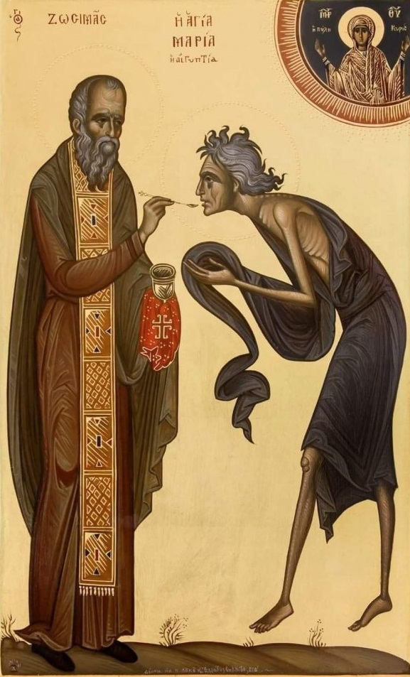 Să vedem în continuare, că în Duminica a 5-a din Postul Mare, Sfânta Maria Egipteanca este pomenită în această zi pentru a ne ține trează râvna credincioşilor și pentru a ne arăta că virtuţile cu care suntem chemaţi ca să ne înnobilăm sufletele pe toată perioada postului au fost împlinite, având în minte cuvintele următoare adresate Sfintei Maria Egipteanca: „Pildă de pocăinţă avându-te pe tine, preacuvioasă Marie, roagă pe Hristos să ne dăruiască nouă aceasta în vremea postului; ca în credinţă şi în dragoste să te lăudăm pe tine cu cântări” (Triod, Utrenia Duminicii a cincea din Postul Mare), de aceea, Pericopa Evanghelică a celei de-a cincea Duminici este plină de înţelesuri duhovniceşti pentru viaţa noastră, pocăința Sfintei Maria Egipteanca fiind considerată un adevărat model al pocăinței și al răstignirii duhovniceşti, după cum spune și o stihiră din cadrul slujbei Vecerniei: „Puterea Crucii Tale, Hristoase, a făcut minune; că şi aceea care mai înainte era desfrânată s-a nevoit cu nevoinţă pustnicească. De unde şi lepădând neputinţa, vitejeşte a stat împotriva diavolului. Pentru aceasta, luând şi răsplata biruinţei, se roagă pentru sufletele noastre!” (Triod, Vecernia Duminicii a cincea din Postul Mare). Aşadar, originară din Egipt, Sfânta Maria a dus, până la un moment dat o viață de desfrânată şi dorința ei era de a corupe cât mai mulți bărbați, pentru a-și satisface plăcerile trupești. În consecinţă, vreme de 17 ani a trăit în desfrânare, iar într-o zi, pe când se adunaseră mulți oameni să meargă la Ierusalim, pe vremea închinării la lemnul Cinstitei Cruci, a cerut și ea ca să meargă împreună cu tinerii, pe drum continuând să păcătuiască în desfrânare. Dar, ajunsă în fața Sfintei Biserici, ceva nevăzut o oprea să intre în lăcașul de închinare și, înțelegând că pricina era viața sa desfrânată şi păcătoasă, atunci s-a rugat la icoana Maicii Domnului, promițând că dacă va fi lăsată să intre, își va schimba viața și va trăi în curăție. Deci. fiindu-i împlinită rugăciunea, Sfânta Maria a trecut apa Iordanului și s-a nevoit în post și în rugăciune timp de 47 ani în pustie, fiind înconjurată de îngeri și înălțată în sus, în timpul rugăciunilor sale. Dar, lupta cu diavolii și cu patimile ispitelor era atât de puternică, încât adesea, sfânta se punea la pământ și nu se mișca, până când nu se risipea ispita! Atunci, Sfântul Cuvios Zosima, cel care a găsit-o spre finalul vieții sale și a împărtășit-o, a fost cel care i-a îngropat trupul în pustie, în secolul al V-lea. Din pocăinţa Mariei Egipteanca putem învăţa că indiferent de mărimea rangului demnităţilor lumeşti, trebuie să respingem ispita slavei deşarte prin smerenie, prin pocăinţă şi post, prin mărturisirea păcatelor, înţelegând folosul duhovnicesc prin care Dumnezeu ne arată că pe drumul spre Ierusalimul Învierii și al Împărăţiei lui Hristos, reperele vieţii creştine sunt dragostea de Dumnezeu, smerenia, milostenia și pocăința!
