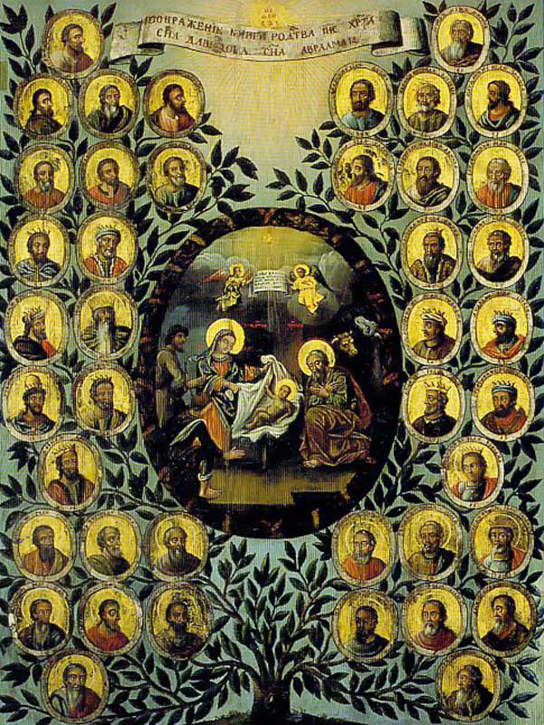 În Duminica dinaintea Naşterii Domnului (a Sf. Părinţi după trup ai Domnului); Ap. Evrei 11, 9-10; 32-40; Ev. Matei 1, 1-25 ( lGenealogia Mântutorului); glas 1, voscr. 4, cu două zile înaintea marii Sărbători, la Sfânta şi Dumnezeiasca Liturghie se citeşte textul Evangheliei din care putem înţelege că tot ceea ce aştepta neamul lui Israel se mărturiseşte prin neamurile care sunt împărţite atât de minunat şi că întru totul de la Avraam până la David sunt 14 neamuri, de la David până la strămutarea în Babilon sunt 14, iar de la strămutarea în Babilon până la Hristos sunt la fel 14 neamuri, iar după Hristos e un singur neam, acela al Domnului Hristos. Cu alte cuvinte, tot ceea ce a fost neam înainte de Hristos devine neam în Biserică, prin Iisus Hristos, până la sfârşitul veacurilor. Aşadar, devine important să ne simţim din familia mare a Mântuitorului Hristos, ca membri ai Familiei Sale! În acest sens, noi suntem invitaţi ca să vedem imediat Naşterea Mântuitorului Hristos în Betleem, dar, mai suntem chemaţi împreună cu păstorii să alergăm, cu magii să-L întâmpinăm pe Hristos, chiar cu Irod să ne îndoim şi să ne tulburăm, atunci când ni se pare că scaunele pe care stăm sunt veşnice şi noi înşine suntem nişte mici dumnezei! În felul acesta, oare, nu suntem fii ai necredinţei, ai întuneriului din suflet, nu cumva, Îl vindem pe Iisus și Îl trădăm prin ceea ce facem și prin modul in care ne comportăm? Devenim un fel de Iuda ai timpurilor moderne şi post-moderne şi dovedim că după ce ne întâlnim cu Hristos, «Lumina lumii», chiar din fața Lui, ieșim afară în bezna vieții, a negativismului, acolo unde ne putem risipi pentru totdeauna! De aceea, devine foarte importantă Duminica aceasta, pentru că ne scoate dintr-un tărâm al rătăcirii, în care lumea de azi L-a uitat pe Hristos, cu toate că Dumnezeu ne arată prin Iubirea Sa milostivă, că Taina Întrupării Fiului şi Cuvântului divin era cunoscută înainte de facerea lumii, ca o lucrare de mântuire a omenirii!