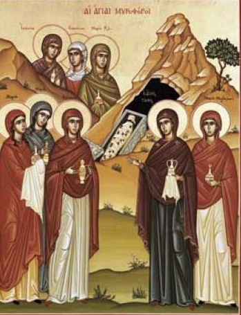 În Duminica a 3-a după Paşti (a Mironosiţelor); Ap. Fapte 6, 1-7; Ev. Marcu 15, 43-47; 16, 1-8; glas 2, voscr.4, din textul Evangheliei care se citeşte la Sfânta Liturghie aflăm că Sfintele Femei mironosiţe sunt cinstitele fiinţe care au venit la mormântul Mântuitorului nostru Iisus Hristos cu miruri, dovedindu-se adevărate modele de credinţă pentru toate femeile creştine. Cu smerenie ascultând şi trăind momentul acesta, constatăm că el are o semnificaţie deosebită, întrucât ne arată că în Biserica dreptmăritoare învăţăm credinţa vie nu numai din învăţătura Sfinţilor Apostoli, care este fundamentală pentru toţi, ci o învăţăm şi din pilda vieţii Sfintelor Femei Mironisiţe. Astfel, în Evangheliile după Sfinţii Marcu şi Matei aceste femei alese şi binecuvântate, sunt mari dascăli ai Bisericii, nu atât prin învăţătura lor teologică, deoarece aceasta nu putea fi diferită de cea a Apostolilor, cât, prin modul lor de a fi şi de a făptui binele, prin modul lor de a exprima starea lor de credinţă şi curaj, de smerenie şi preţuire faţă de Mântuitorul Cel răstignit şi Înviat din morţi. Se poate compara prin contrast, curajul femeilor mironosiţe cu teama prea mare a ucenicilor lui Iisus. Deci, pe când ucenicii Săi, viitorii Apostoli, erau adunaţi şi încuiaţi în casă de frica iudeilor, dis-de-dimineaţă, la revărsatul zorilor, Maria Magdalena, Maria, mama lui Iacov şi a lui Iosie, şi Salomeea au cumpărat aromate sau miresme ca să ungă trupul Mântuitorului, iar, Evanghelia după Sfântul Evanghelist Marcu ne arată că în sufletul acestor femei iubirea şi preţuirea faţă de Hristos erau mai tari decât teama de primejdie! Ele aveau un curaj deosebit, pe care în dimineaţa Învierii lui Hristos nu l-au avut ucenicii Săi, de aceea, Dumnezeu ne îndeamnă ca să aducem un pios omagiu femeilor mironosiţe, care au dovedit, cu un curaj deosebit, că sunt cele dintâi vestitoare ale Învierii Domnului!