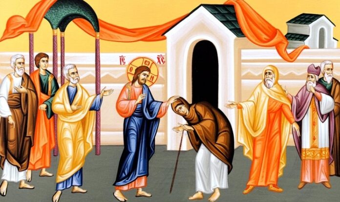 Aşadar, în Duminica a 27-a după Rusalii, Sfântul Evanghelist Luca ne spune că, într-o sâmbătă, pe când Mântuitorul se afla într-o sinagogă, a văzut o femeie gârbovă, care de optsprezece ani stătea cu fața plecată spre pământ, iar, una dintre virtuțile acestei femei bolnave este că, deși nu putea să ridice privirea în sus, nici să vadă fețele oamenilor, era nelipsită din sinagogă şi venea permanent pentru a se ruga stăruitor și cu răbdare pentru ca Dumnezeu să vindece neputința sa! Iar, textul Evangheliei sună astfel: «În vremea aceea Iisus învăța într-una din sinagogi sâmbăta. Și, iată, era acolo o femeie care avea de optsprezece ani un duh de neputință și care era gârbovă, încât nu putea să se ridice nicidecum. Iar Iisus, văzând-o, a chemat-o și i-a zis: ,,Femeie, ești dezlegată de neputința ta”! Și Și-a pus mâinile asupra ei, iar ea îndată s-a îndreptat și slăvea pe Dumnezeu. Atunci mai-marele sinagogii, mâniindu-se că Iisus a vindecat-o sâmbăta, răspunzând, zicea mulțimii: Șase zile sunt în care trebuie să se lucreze; deci veniți în aceste zile și vă vindecați, iar nu în ziua sâmbetei! Domnul însă i-a răspuns și a zis: ,,Fățarnicilor! Fiecare dintre voi nu dezleagă, oare, sâmbăta boul sau asinul său de la iesle și nu îl duce să-l adape? Dar aceasta, fiică a lui Avraam fiind, pe care a legat-o Satana, iată, de optsprezece ani, nu se cuvenea, oare, să fie dezlegată de legătura aceasta în ziua sâmbetei”? Și, zicând El acestea, s-au rușinat toți cei ce erau împotriva Lui, iar poporul întreg se bucura de toate faptele cele slăvite, săvârșite de Dânsul. (Ev. Luca 13, 10-17). Din lectura şi mai ales din audierea textului înţelegem că Iisus Hristos nu este nepăsător la suferința oamenilor, vindecând boala și dăruind sănătate sufletească și trupească, deci, văzând credința vie și smerită, cum este și cazul femeii gârbove, care îşi purta crucea sa în tăcere, sufletul ei era îndreptat spre cer, în stare de profundă rugăciune! Tocmai datorită smereniei sale, femeia gârbovă a fost cercetată de Dumnezeu şi îndată ce trupul său a fost vindecat, L-a preamărit pe Dumnezeu, devenind un exemplu pentru noi toți. Ea devine un adevărat model în această perioadă de pregătire pentru a-L primi pe Pruncul Iisus Hristos în peștera inimilor noastre, un model de credință puternică, de smerenie adâncă și de răbdare în suferință. Cu Bunăvoirea Lui Dumnezeu putem să ne încălzim sufletele prin rugăciune, prin post și prin milostenie, spovedindu-ne și unindu-ne unii cu alții prin Taina Sfântului Potir, pentru că în felul acesta, devenim tari în credință, ca să ne cultivăm smerenia, să dăruim milostenie celor aflați în nevoinţe, înmulțind rugăciunea și întărindu-ne răbdarea la vreme de încercare. Aflăm din Evanghelie că în cazul femeii gârbove, neputința ei, întoarcerea ei către cele pământești se manifestă în mod fizic, pentru că era pur și simplu cocoșată și privea spre cele de jos, dar, în cazul multora dintre noi, neputința aceasta de a privi spre cele de sus, spre cele cerești, spre cele dumnezeiești, spre cele duhovnicești, neputința de a trăi așa cum suntem chemați să trăim se traduce prin ceea ce astăzi lumea medicală numește depresie sau ceea ce părinții Bisericii numesc «akedie», pentru că în literatura duhovnicească, acest termen are un conținut mult mai larg decât în lumea psihologică. În concluzie, mesajul principal al Evangheliei Duminicii a 27-a după Rusalii este îndemnul la fapta milostivă, oferindu-ne drept pildă pe Însuși Mântuitorul Iisus Hristos, care săvârșește binele fără ca să fie rugat, fără ca să I se ceară, fiindcă femeia gârbovă nu a cerut vindecare de la Domnul Iisus, ci, El din propria Sa Milostivire a chemat-o la Sine și i-a spus: ,,Femeie, ești dezlegată de neputința ta!” (Luca 13,12). Prin această pildă minunată, suntem chemaţi și noi să nu așteptăm ca să fim rugați stăruitor spre a face binele, ci, atunci când observăm că un om are nevoie de ajutorul nostru, să-l ajutăm din inițiativă proprie și fără a aștepta ceva răsplată în schimb! De câte ori avem pretenții şi așteptări de la ceilalți, mai întotdeauna apare întristarea, dar, de câte ori, în schimbul faptei noastre bune sau al iubirii noastre așteptăm recunoștință de la ceilalţi și dragoste, sunt toate șansele ca să fim nedumeriţi, fiindcă totul ține de modul cum înţelegem faptul că Dumnezeu pune problema mântuirii, pentru că asemenea femeii gârbove, nimeni şi niciodată nu poate pune la îndoială dovada şi autenticitatea miracolului milostivirii!