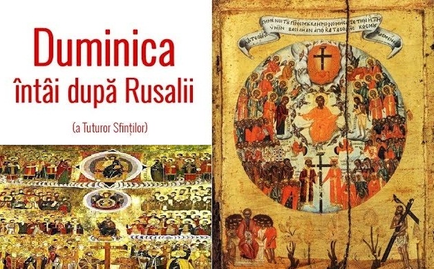În Duminica întâi după Rusalii (a Tuturor Sfinţilor); Ap. Evrei 11, 33-40; 12, 1-2; Ev. Matei 10, 32-33; 37-38 şi 19, 27-30 (Urmarea lui Hristos); glas 8, voscr.1 (Lăsatul secului pentru Postul Sf. Ap. Pertu şi Pavel), la Sfânta şi Dumnezeiasca Liturghie, textul Sfintei Evanghelii ne arată că Sfânta noastră Biserică îi pomenește pe toți sfinții care din veac au bineplăcut lui Dumnezeu ca un rod al Sfântului Duh, deoarece ei au atins acest nivel înalt al sfințeniei datorită lucrării harului Sfântului Duh! Deoarece, după Cincizecime, toți cei ce credeau în Dumnezeu se umpleau de Duhul Sfânt prin dumnezeieștile Taine, trăind cu Duhul și aducând roade duhovnicești, cu toţi am înţeles că fiecare dintre ei se asemăna cu un pom roditor și cu multe frunze, și toți împreună au alcătuit marea grădină a Sfinţilor lui Dumnezeu, raiul duhovnicesc, cel sălășluit dintotdeauna în ceruri. Tocmai pe aceşti sfinţi locuitori ai Raiului ni-i pune în această Duminică Sfânta Biserică să-i avem în suflet, ca şi de acum înainte spre învățătură, oglindă a contemplării noastre pline de credință, iar vieții noastre râvnitoare să ne fie pilduitoare cale de urmare! Aceștia sunt mucenicii, binecuvântaţii, pustnicii, postitorii, primitorii de străini, dăruitorii de milostenie, «nebunii» pentru Hristos, luminătorii inimilor, păstorii și învățătorii cei înţelepţi! Cu sfială, să ne apropiem de fiecare floare îmbobocită și de fiecare pom înfrunzit ca să le sorbim aroma prin cugetarea minţii și prin simțirea inimii, ca să nu ne îndepărtăm până ce nu ne vom umple până la înmiresmare cu dorința de a ne face ascultătorii şi următori lor, pentru a fi următorii Lui Hristos, mai ales că Dumnezeu S-a descoperit oamenilor în trup şi prin toţi sfinţii Săi, apoi S-a Înălţat în cereasca-I Împărăţie şi a semănat sămânţa unei credinţe noi şi a unei vieţi noi!