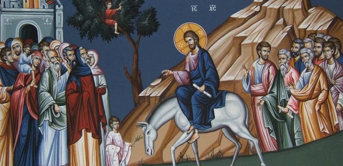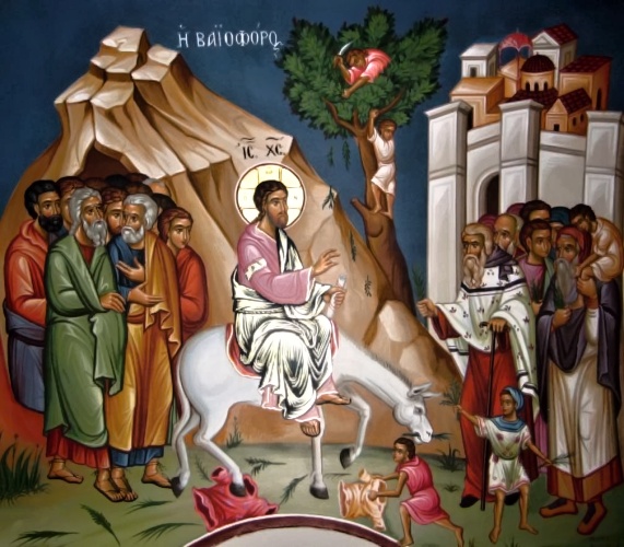 Această Duminică este numită şi Duminica Floriilor, având ca argument întâmpinarea Domnului cu crenguţe de smochin, ea fiind prevestită de către proroci cu mulţi ani înainte: „Bucură-te foarte fiica Sionului, veseleşte-te, fiica Ierusalimului, că iată împăratul tău vine la tine, drept şi biruitor, smerit şi călare şezând pe mânzul asinei” (Zaharia 9, 9), ceea ce înseamnă că o asemenea prorocire se referea la Mesia, care vine pentru a intra în Ierusalim ca să se împlinească legea, căci «a venit ceasul ca să fie mărit Fiul Omului» (Ioan 2, 1, 3). Înainte de Paști, cu șase zile, Iisus a venit în Betania, unde era Lazăr, pe care îl înviase din morți. Și I-au făcut acolo cină și Marta slujea, iar, Lazăr era unul dintre cei ce ședeau cu El la masă. Atunci, Maria, luând o litruţă cu mir de nard curat, de mare preț, a uns picioarele Domnului Iisus și le-a șters cu părul capului ei, iar casa s-a umplut de mireasma îmbietoare a mirului. Dar, Iuda Iscarioteanul, unul dintre ucenicii Lui, care avea să-L vândă, a spus nedumerit: «Pentru ce nu s-a vândut mirul acesta cu trei sute de dinari și să-i fi dat săracilor»? Însă, el a zis aceasta, nu pentru că îi era grijă de săraci, ci pentru că era fur și, având punga, lua din ce se punea în ea. A zis, deci, Iisus: ,,Las-o, că pentru ziua îngropării Mele l-a păstrat! Că pe săraci, totdeauna îi aveți cu voi, dar pe Mine nu Mă aveți totdeauna! Deci, mulțime mare de iudei au aflat că este acolo și au venit nu numai pentru Iisus, ci să vadă și pe Lazăr, pe care-l înviase din morți. Și s-au sfătuit arhiereii ca și pe Lazăr să-l omoare, căci, din pricina lui, mulți dintre iudei mergeau și credeau în Iisus. A doua zi, mulțimea care se adunase la sărbătoare, auzind că Iisus vine în Ierusalim, a luat ramuri de finic și a ieșit întru întâmpinarea Lui și striga: «Osana! Binecuvântat este Cel ce vine întru numele Domnului, Împăratul lui Israel!». Și Iisus, găsind un asin tânăr, a șezut pe el, precum este scris: «Nu te teme, fiica Sionului! Iată, Împăratul tău vine șezând pe mânzul asinei», mai ales că atunci, toate acestea nu le-au înțeles ucenicii Lui, dar, când S-a preaslăvit Iisus, atunci și-au adus aminte că acestea erau scrise despre El și că acestea I le-au făcut Lui. Așadar, dădea mărturie mulțimea care era cu El când l-a strigat pe Lazăr din mormânt și l-a înviat din morți. De aceea L-a și întâmpinat mulțimea, pentru că auzise că El a făcut minunea aceasta care uimise toată suflarea şi care arăta că Dumnezeu vine pentru a intra în Ierusalim ca să se împlinească legea şi Se dăruieşte pe Sine întru strălucirea Slavei Sale şi a mântuirii existenţei noastre în veşnicie!