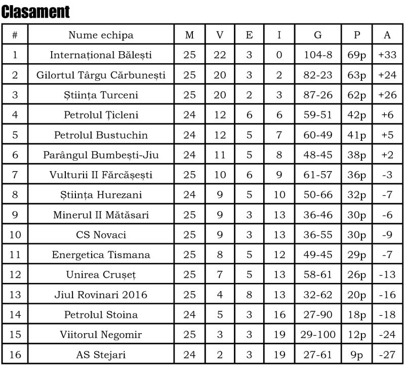 Internaţional Băleşti îşi continuă parcursul fără greşeala în Liga a 4-a. Formaţia lui Dan Vasilică s-a impus, la limită, în deplasarea de la CS Novaci, pe un teren impracticabil, îmbibat cu apă. Astfel, liderul îşi păstrează avansul de 6 puncte luat în urmă cu câteva runde. Din nefericire, nu toate meciurile programate s-au şi disputat în etapa cu numărul 25. Partida dintre Parângul Bumbești-Jiu şi Petrolul Stoina a fost întreruptă din cauza vremii nefavorabile, iar jocul dintre Petrolul Bustuchin şi Petrolul Ţicleni nu s-a mai ţinut pentru că oficialii oaspeţilor au uitat acasă carnetele jucătorilor. Ambele cazuri vor fi analizate de către Comisia de Disciplină.