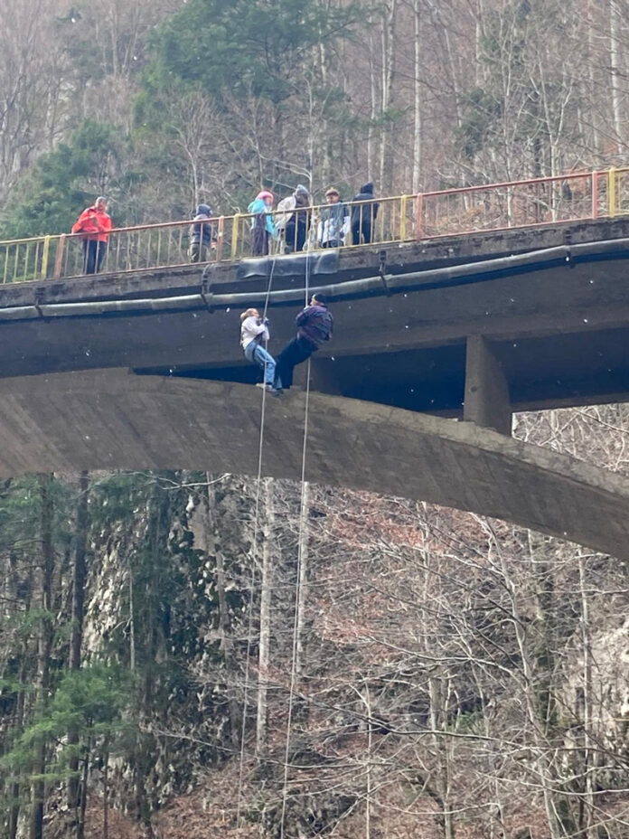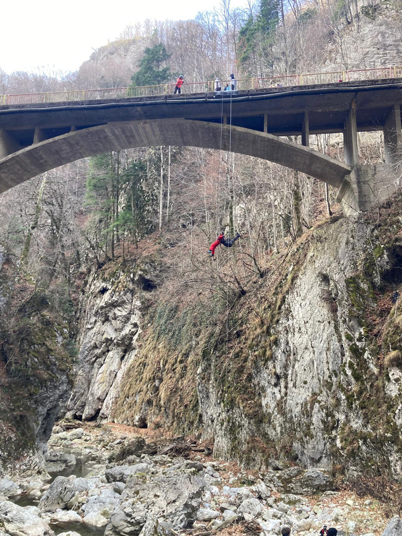 Nu am mai coborât niciodată, prima dată a fost mai cu emoții, dar apoi am mai coborât de câteva ori, ca dovadă că mi-a plăcut. Totul se desfășoară în siguranță, nu există vreun pericol, trebuie doar un pic de curaj”, a spus acesta. O parte din cei prezenți s-au răcorit apoi, la propriu, în apa înghețată a Oltețului. Au spart gheața cu un ciocan și s-au bălăcit în ea pentru câteva clipe, chiar dacă a fost extrem de rece. Inițiatorul proiectului, Gabriel Dan Chiriac, i-a supravegheat îndeaproape pe toți cei care au coborât în rapel și au intrat și în apă, el menționând că astfel de activități sunt recomandate doar persoanelor sănătoase.