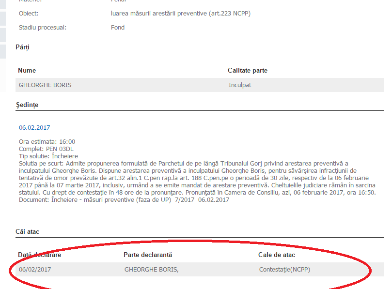 ”Admite propunerea formulată de Parchetul de pe lângă Tribunalul Gorj privind arestarea preventivă a inculpatului Gheorghe Boris.  Dispune arestarea preventivă a inculpatului, pe o perioadă de 30 de zile. Cu drept de contestaţie în 48 ore de la pronunţare”, a stabilit prima instanță. Rudele sale susțin că este nevinovat și că nu a făcut altceva decât să se apere, după ce el ar fi fost agresat. Suspectul s-a filmat în timp ce se afla în club și a postat imaginile pe internet, cu aproximativ o oră înainte de încăierare.