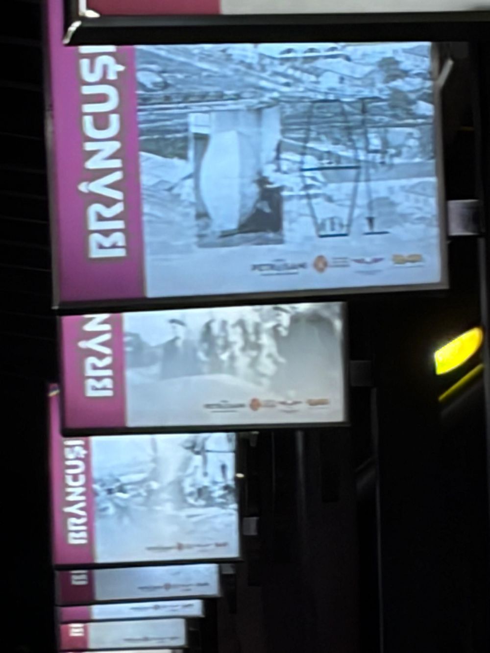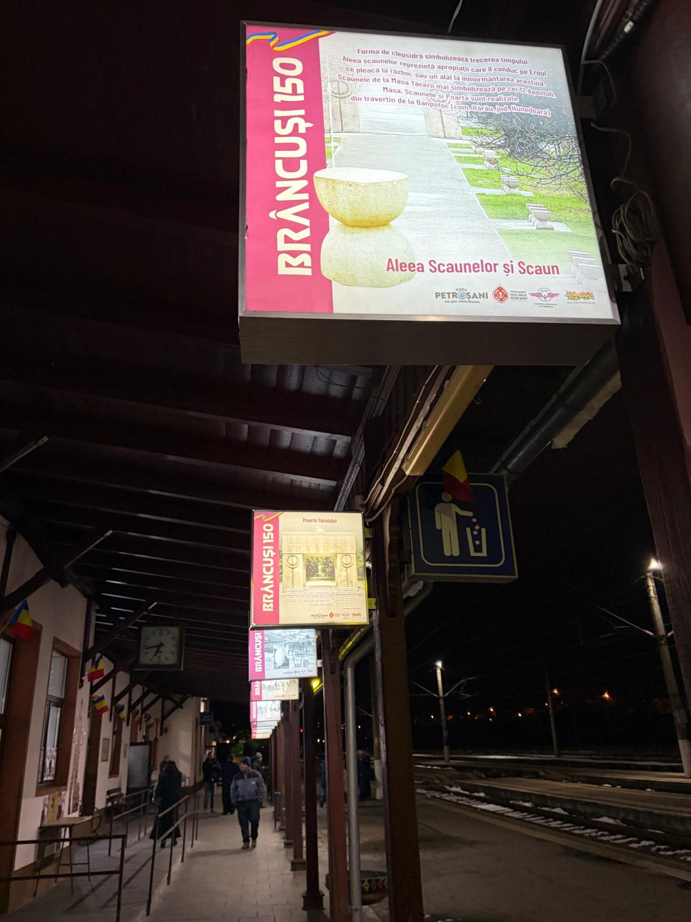 Este vorba despre cea organizată la gara din Petroșani, unde a fost amenajată o mică galerie de artă, menită să le aducă aminte atât localnicilor, cât și călătorilor care trec pe aici că Petroșani este locul unde a fost creată Coloana fără Sfârșit. Fotografii cu operele maestrului, cu lucrări de-ale sale din toată lumea, dar și de la Târgu Jiu, sunt expuse pe stâlpii de pe peronul principal al gării într-un efort făcut de șeful CFR de aici, Dorel Șchiopu, de a schimba un pic imaginea zonei, dar și marcare a celor 150 de ani scurși de la venirea pe lume a lui Brâncuși. Culmea este că în momentul în care se făcea inaugurarea expoziției respective dintr-un tren ce a oprit pentru câteva minute în cocheta gară din Petroșani a coborât și o familie din Târgu Jiu, venită cu copiii la plimbare și care nu știa că aici fuseseră realizate în 1937 modulele din fontă ale Coloanei. „Ne-am urcat în tren pentru că este vacanța de schi a copiilor și am zis să ne plimbăm un pic pe aici prin zonă, mai ales că a nins și e frumos prin Defileu. Am fost surprinși să vedem pe peron acest eveniment. Ne bucurăm, nu știam de legătura lui Brâncuși cu Petroșaniul, aici am înțeles că a fost realizată Coloana, ceea ce face lucrurile și mai interesante. Brâncuși este un ambasador al nostru, al gorjenilor, dar și al tuturor românilor și cred că acțiuni de genul acesta, prin care să îl cunoaștem mai bine, ar trebui făcute nu doar la astfel de zile importante”, a spus gorjeanul ajuns în gara din Petroșani. Nici localnicii nu știau că modulele Coloanei au fost turnate în orașul lor, de atelierele în care s-a desfășurat activitatea respectivă alegându-se praful după 1990. „Eu am lucrat acolo și așa am aflat de la alți colegi că aici s-a făcut Coloana. Era turnătoria veche din fontă care nu s-a mai păstrat însă. S-a demolat totul că au zis că se face nu știu ce și, cum e la noi, nu s-a mai făcut nimic. E totul ras, din păcate”, a spus un fost muncitor prezent și el în gară la inaugurarea expoziției. Un alt participant la expoziția la care a fost prezent și profesorul Ion Mocioi, fost senator de Gorj, care le-a vorbit celor prezenți despre viața lui Brâncuși, a declarat și el cu mândrie că Petroșaniul poate să spună oricând și oricui că a contribuit la realizarea celei mai importante lucrări a lui Brâncuși. „ Azi am luat parte la inaugurarea unei expoziții speciale, dedicate lui Brâncuși – a cărui cea mai celebră creație românească e legată și de Valea Jiului. Da, modulele