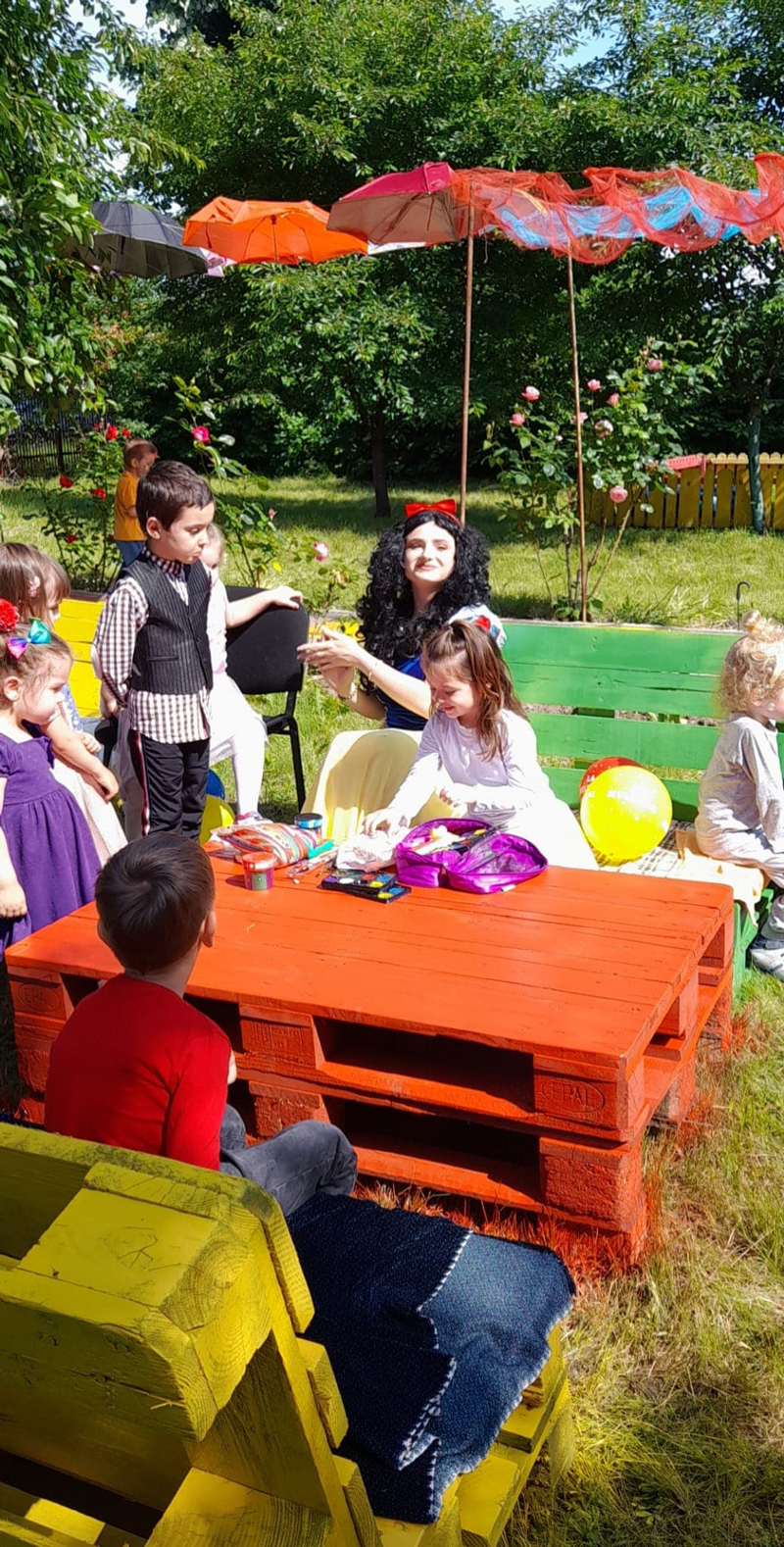Au încropit din câțiva paleți măsuțe și băncuțe pe care le-au vopsit în culori vii și au vopsit și aleea de la intrarea în grădiniță.