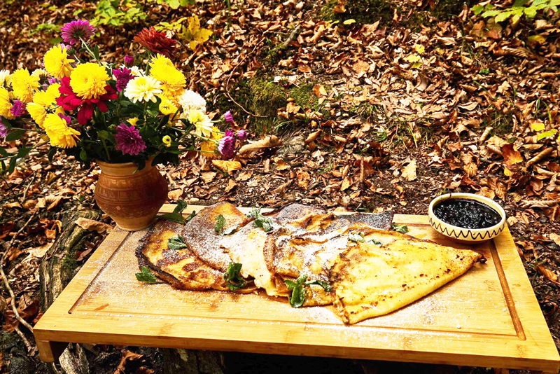 Scoatem clătitele din tigaie, presarăm zahăr pudră peste ele și le servim alături de sosul de coacăze negre.