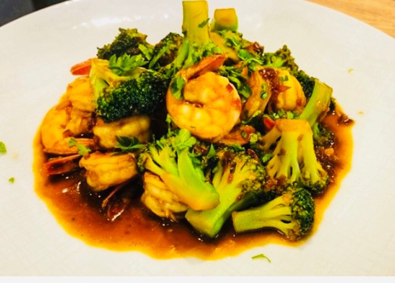 scoatem brocoli şi îl introducem în apa cu gheaţă. Într-o tigaie adăugăm ulei de măsline, când tigaia s-a încins bine adăugăm creveţi şi prăjim 3 trei minute pe o parte după care