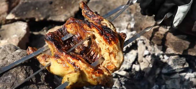 Se înfig bețele de frigărui prin pui, după care se pune la temperatura indirectă a cărbunilor, cam vreo 25-30 cm.