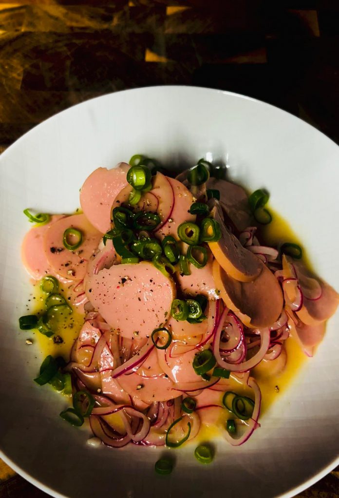 Este foarte important să folosim acest tip de cârnat ,,Knacker“, pentru că se îmbină foarte bine cu restul produselor. Curățăm cârnatul de piele, apoi îl tăiem feliuțe foarte subțiri. Eu am folosit o răzătoare cu un cuțit special, în așa fel încât, totul a mers mai repede.