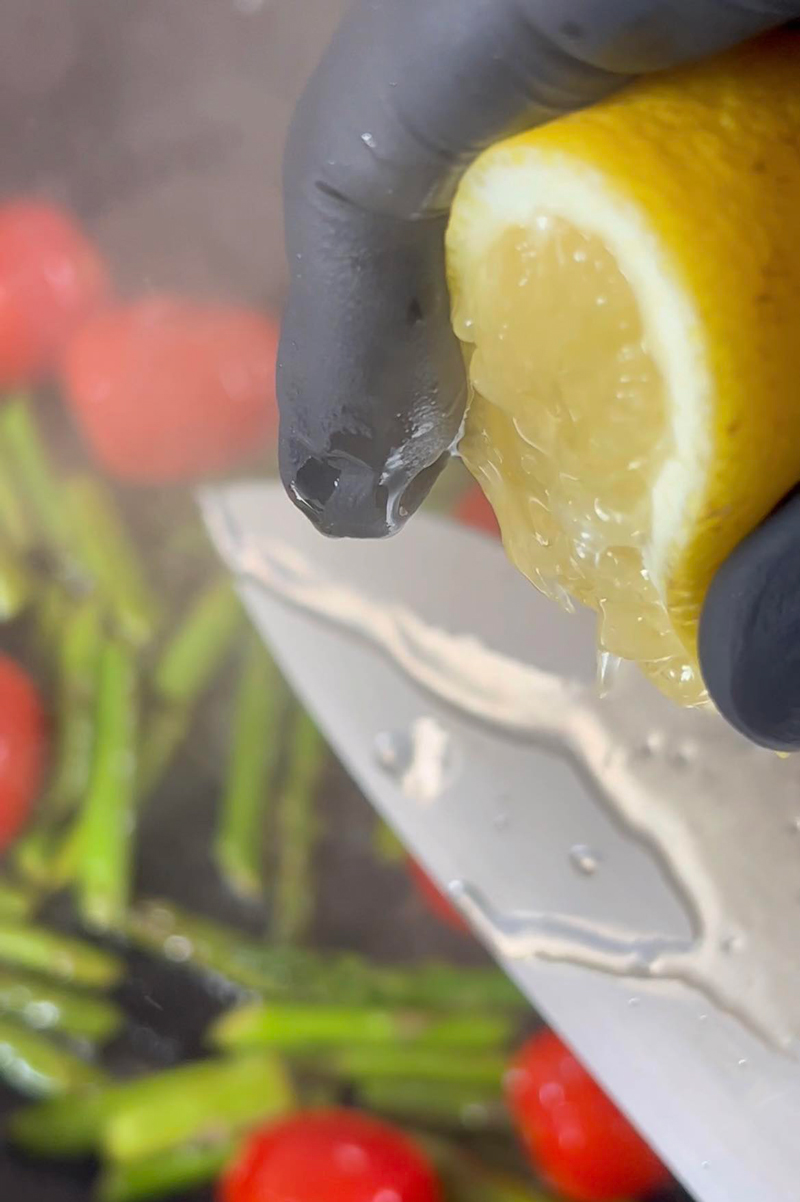 Adăugăm o lingură de ulei într-o tigaie, apoi sotăm pentru 2 minute sparanghelul, amestecând continuu, adăugăm roșiile cherry apoi sotăm mai departe pentru 2 minute.