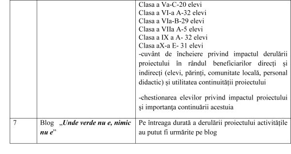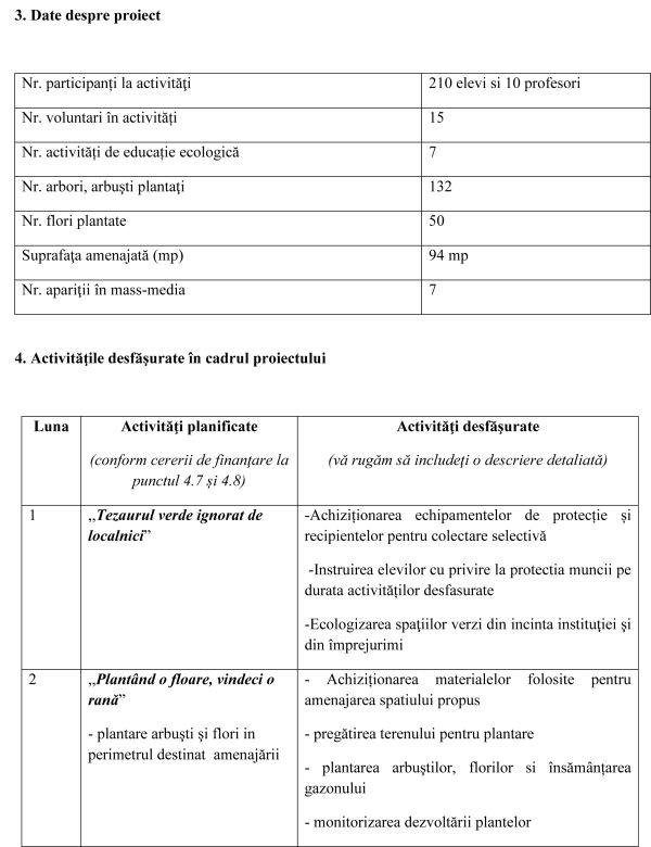 1. Scopul proiectului „Unde verde nu e, nimic nu e”, finanțat de Fundația pentru Parteneriat şi MOL România, a fost conştientizarea elevilor şi a comunităţii locale privind necesitatea implicării în protejarea mediului, prin acţiuni de ecologizare în incinta şcolii și în împrejurimi, refacerea şi înfrumuseţarea spaţiilor verzi şi colectarea selectivă a deşeurilor electrice şi electronice.