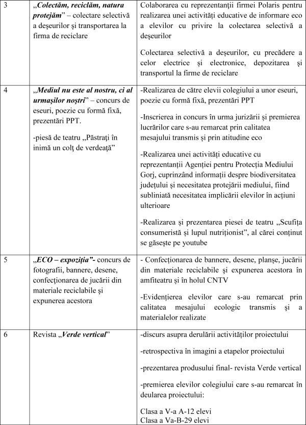 – prezentarea produsului final – revista „Verde vertical”, redactată de prof. dr. Taşcău Dorin Dan şi prof. Burtea Protesoiu Gabriela şi Calotă Rodica.