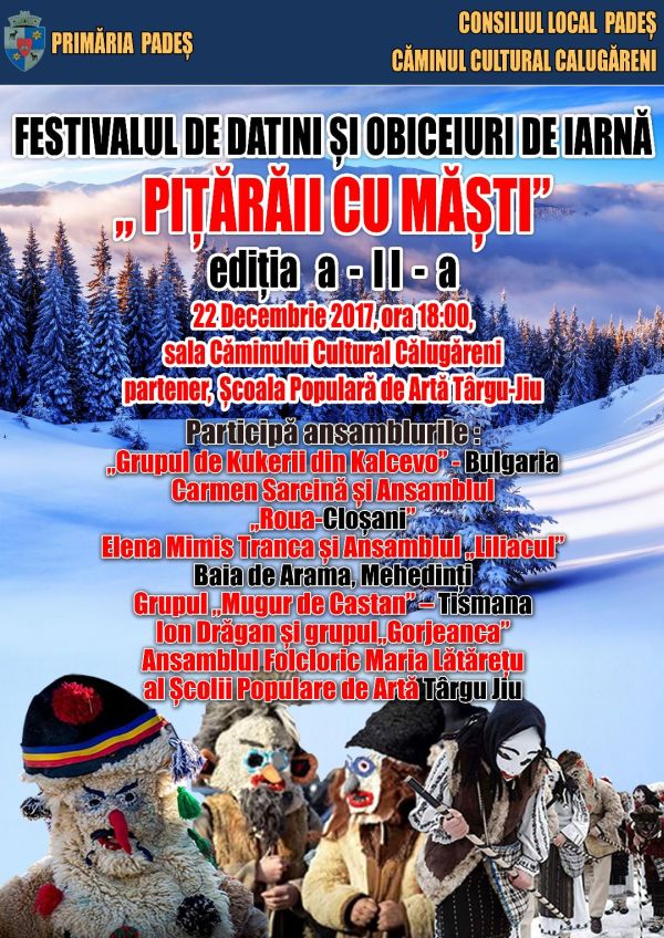 Şcoala Populară de Artă (ŞPA) Târgu-Jiu, alături de Consiliul Judeţean Gorj, Consiliul Local şi Primăria Comunei Padeş, organizează în data de 22 decembrie Festivalul de datini şi obiceiuri de iarnă „Piţărăii cu măşti”, ediţia a II-a. Evenimentul se va desfăşura la Căminul Cultural Călugăreni, comuna Padeş, începând cu ora 18.00. În toate satele comunei Padeş are loc, în Ajunul Crăciunului, un obicei unic în Oltenia: piţărăii cu măşti. Tinerii satului îşi fac măşti şi, în Ajunul Crăciunului, la prânz, se strâng în capul satului, plecând apoi în colindeţi. La eveniment vor participa: Grupul „Kukerii”, din Kalcevo, Bulgaria, care va reprezenta tradiţiile din regiunea Yambol. Este unul dintre cele mai bune grupuri, nu numai din Yambol, ci şi din Bulgaria, câştigători a multor premii naţionale şi regionale, aflat la această ediţie la invitaţia Şcolii Populare de Artă din Târgu-Jiu; Ansamblul Folcloric „Roua” din Cloşani, coordonatorul şi fondatorul Ansamblului – Carmen Felicia Sarcină; Ansamblul Folcloric „Liliacul” din Baia de Aramă, coordonator Elena Mimiş Trancă; Ansamblul Folcloric „Mugur de castan” din Tismana, coordonator Sorin Bivolaru; Grupul „Gorjeanca”, coordonator Ion Drăgan; Orchestra şi soliştii Ansamblului Folcloric “Maria Lătăreţu”, dirijor Constantin Argint.