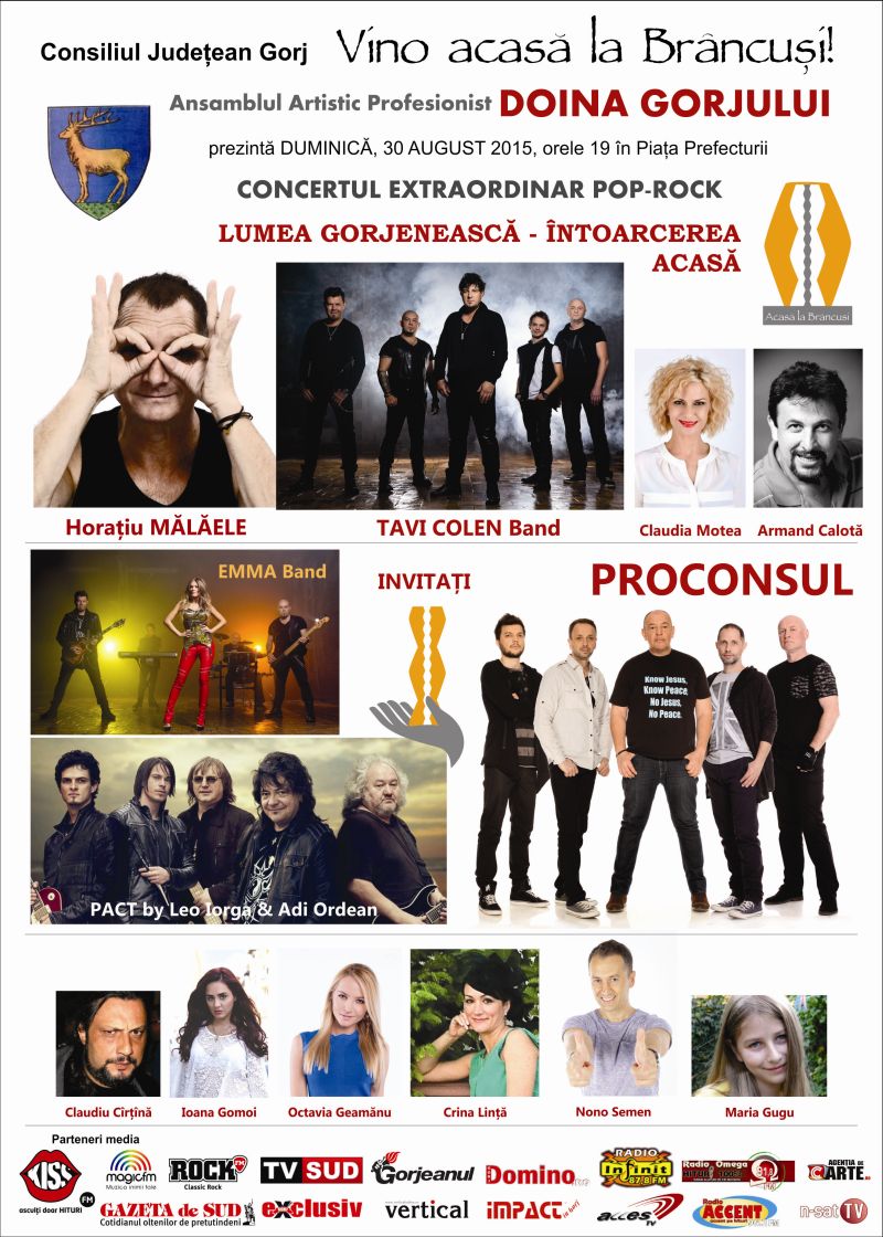 CONCERT POP ROCK: PROCONSUL, PACT by Leo Iorga & Adi Ordean, EMMA BAND și gorjenii Tavi Colen (&Band), Horațiu Mălăele, Armand Calotă, Claudia Motea, Nono Semen, Octavia Geamănu, Claudiu Cîrțînă, Maria Gugu.