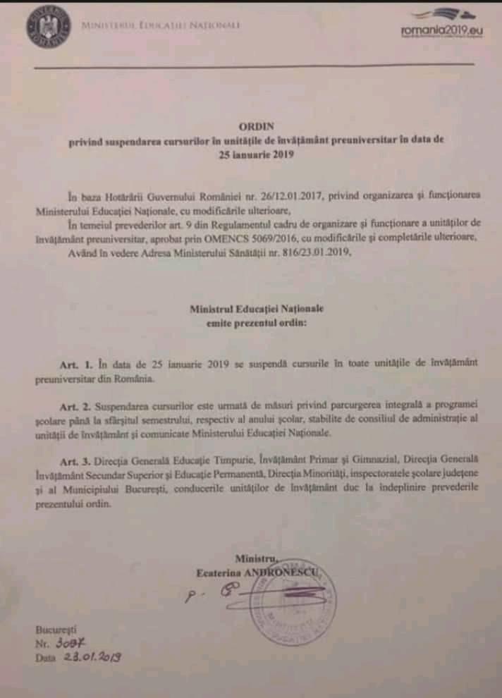 Weekend prelungit pentru elevi și preșcolari! Ministerul Educației a aprobat un ordin prin care s-a decis ca astăzi, 25 ianuarie 2019, să fie zi liberă pentru elevii, preșcolarii și cadrele didactice din învățământul preuniversitar. Ordinul de ministru a fost dat din cauza răspândirii gripei, după ce Ministerul Sănătăţii a trimis o adresă către Ministerul Educaţiei în acest sens. Copiii au parte astfel de 4 zile libere: joi, 24 ianuarie, liber de ziua Unirii Principatelor Române, vineri 25 liber și cele două zile de weekend.
