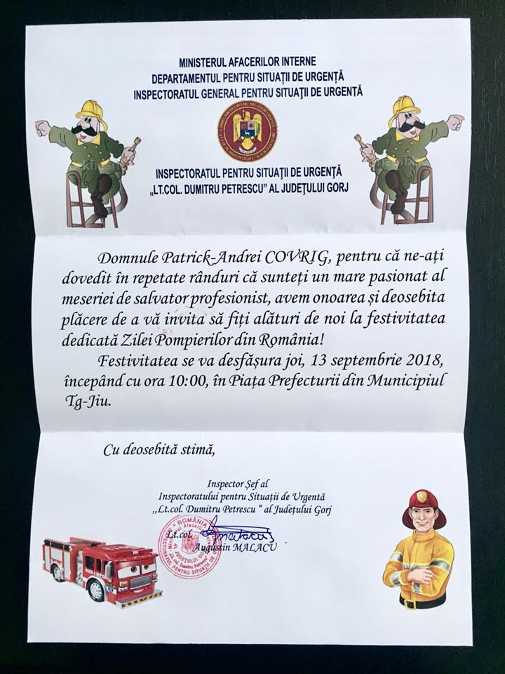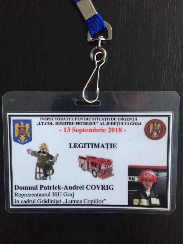 Un copil de patru ani, de la Grădinița ”Lumea Copiilor” din Târgu-Jiu, a avut parte de o adevărată surpriză, ieri dimineață. Patrick a fost vizitat de reprezentanții Inspectoratului pentru Situații de Urgență Gorj, care, pe lângă faptul că l-au invitat să participe la evenimentele organizate, joi,  de Ziua Pompierilor,  i-au oferit și o legitimație de reprezentant al salvatorilor în cadrul grădiniței la care este înscris. Îmbrăcat în pompier, Patrick Andrei Covrig a participat, anul trecut, la evenimentele organizate de reprezentanții ISU de Ziua Pompierilor.  Încă de atunci, băiețelul spunea că își dorește să devină salvator, iar ieri a avut parte de o surpriză.  O autospecială de la ISU Gorj s-a oprit în curtea grădiniței la care este înscris, iar purtătorul de cuvânt al instituției, Florin Chisim, l-a invitat să fie alături de pompieri pe 13 Septembrie, în Piața Prefecturii, la ora 10.00, când sunt pregătite mai multe surprize. Totodată, Patrick a primit și o legitimație de reprezentant al ISU în cadrul grădiniței. Băiețelul a acceptat invitația de a participa la Ziua Pompierilor din România, care va începe cu defilarea militarilor din cadrul ISU Gorj și o expoziție a tehnicii de intervenție, în cadrul căreia cei care doresc pot prelua pentru câteva momente rolul salvatorului profesionist. ”Ne-am cunoscut acum un an cu ocazia Zilei Pompierilor din România, iar de atunci acest domn ne-a vizitat ori de câte ori a avut ocazia, fie în cadrul programului Școala Altfel, fie în cadrul Zilelor Porților Deschise organizate de către instituția noastră. Patrick este un mare admirator al misiunilor salvatorilor profesioniști, s-a declarat convins că va fi un brav pompier atunci când va crește și pentru asta s-a dotat cu un echipament de pompieri croit atent pe măsura trupului său și, bineînțeles, cu multe autospeciale și accesorii de pompieri, deocamdată, de jucărie. Suntem în pragul sărbătoririi Zilei Pompierilor din România și ne-am propus să avem alături de noi în această zi importantă, toți prietenii și colaboratorii. Drept urmare, astăzi, am mers cu o autospecială adevărată de pompieri la grădinița unde învață bunul nostru prieten Patrick și ne-am permis să-l invităm pentru a fi alături de noi cu ocazia Zilei Pompierilor din România, care va fi sărbătorită în data de 13 Septembrie, în Piața Prefecturii din Municipiul Târgu-Jiu. Pentru că ne-a dovedit și că este foarte pregătit în domeniul situațiilor de urgență, l-am desemnat, cu acte în regulă, reprezentantul nostru în cadrul grădiniței unde învață. Suntem convinși că legitimația de reprezentant ISU o va purta cu mândrie, dar am observat că și colegele de grădiniță s-au arătat foarte interesate de noua funcție a colegului lor”, a precizat Florin Chisim, purtătorul de cuvânt al ISU Gorj.