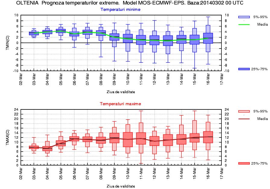 Pe tot parcursul intervalului de prognoză, atât regimul termic mediu diurn cât şi cel nocturn nu vor avea variaţii semnificative. Astfel, mediile temperaturilor maxime vor fi de 2…4 grade, iar ale celor minime de -5… -2 grade.