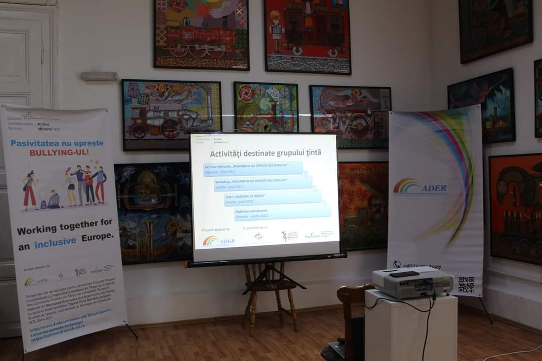 „In atmosfera suprarealista prilejuită de lucrarile pictorului Florin Hutium (expozitia este gazduita de Muzeul Judetean Gorj), am discutat realist despre bullying, despre implicare, despre modul in care putem să ne influentam viata prin deciziile noastre. Elevii de la Liceul de Arte Constantin Brăiloiu din Targu Jiu, (voluntari ADER) au prezentat intr-o sceneta cateva acte de bullying, fiind prezentat și spotul Pasivitatea nu opreste Bullyingul. Am prezentat rezultatele studiului privind fenomenul de bullying in judetele Gorj si Prahova remarcand categoriile de elevi ce sunt predispuse bullying-ului. În urma discutiilor am concluzionat că este nevoie de implicare, este nevoie de sustinere și este nevoie să nu mai fim pasivi si sa privim, nepasatori, scenele de bullying ce se petrec langă noi”, au transmis reprezentanții ADER.