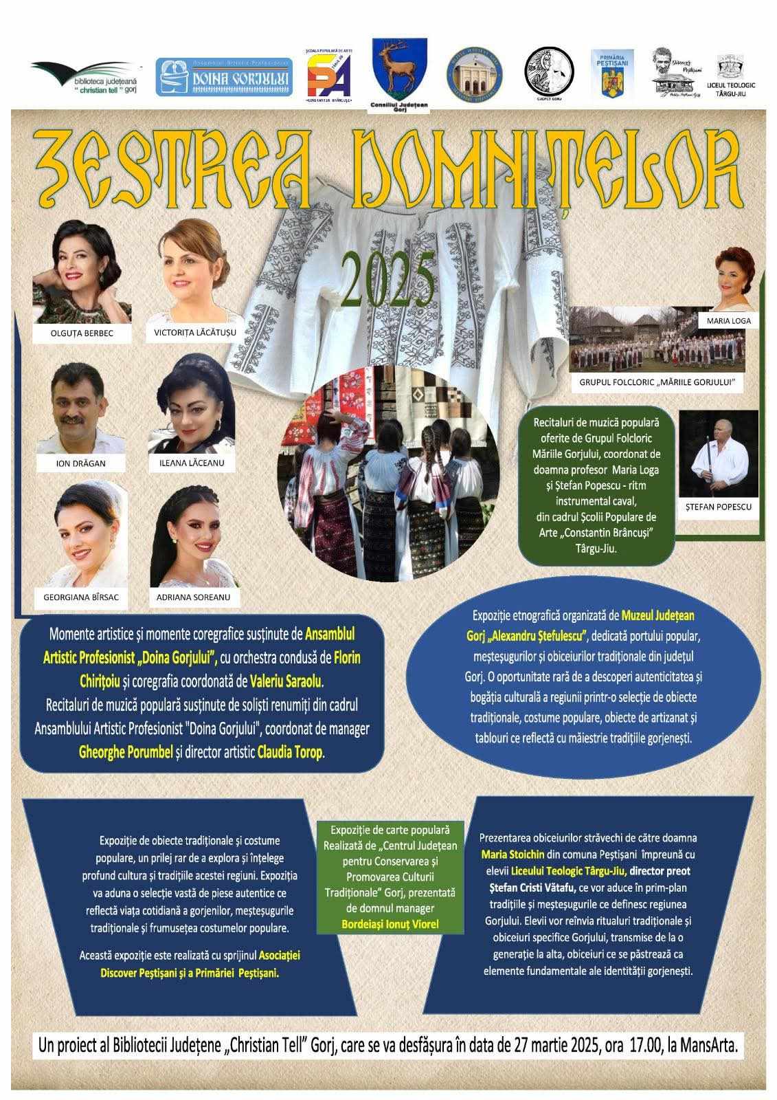 ”Joi, 27 martie 2025, la MansArta Bibliotecii Județene ”Christian Tell” Gorj, începând cu ora 17:00, avem deosebita onoare de a vă invita să participați la evenimentul cultural-artistic ”Zestrea Domnițelor”, o manifestare dedicată promovării și conservării portului popular românesc și a obiceiurilor tradiționale autentice. Evenimentul va avea loc cu sprijinul Consiliului Județean Gorj. Prin acest eveniment ne propunem să aducem în prim-plan frumusețea portului popular românesc, a artei populare românești și a obiceiurilor strămoșești, reunind renumiți artiști, tineri și oameni de cultură, într-o atmosferă de poveste.