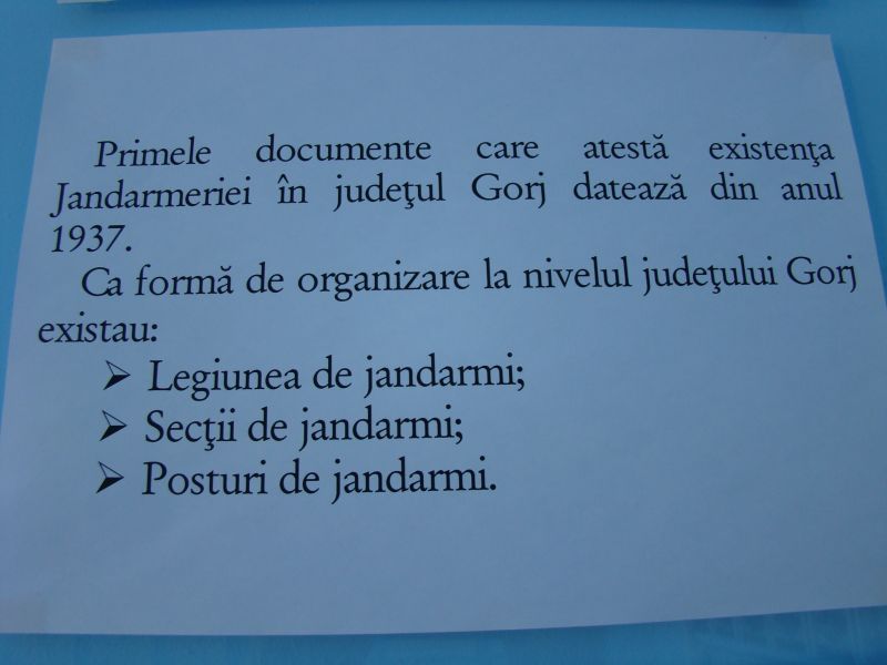 „În Muzeul unităţii sunt reliefate momente din moştenirea lăsată de predecesorii noştri, fiind reliefată în fotodocumente şi fotografii istoria Jandarmeriei Rurale în judeţul Gorj, din care rezultă că existau legiunea de jandarmi, secţii de jandarmi şi posturi de jandarmi la nivelul judeţului”, a mai spus purtătorul de cuvânt al Jandarmeriei Gorj.