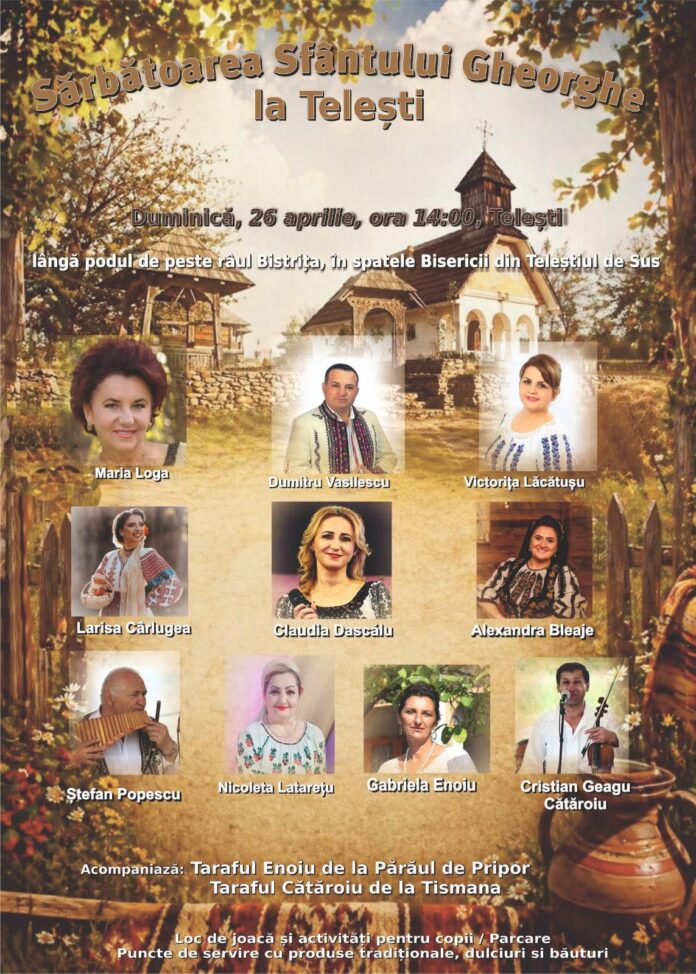 Duminică, 26 aprilie, începând cu ora 14:00, localnicii și toți cei dornici de autentic sunt așteptați în Teleștiul de Sus, în apropierea podului peste râul Bistrița, în spatele bisericii, pentru a lua parte la o adevărată sărbătoare a tradițiilor românești.