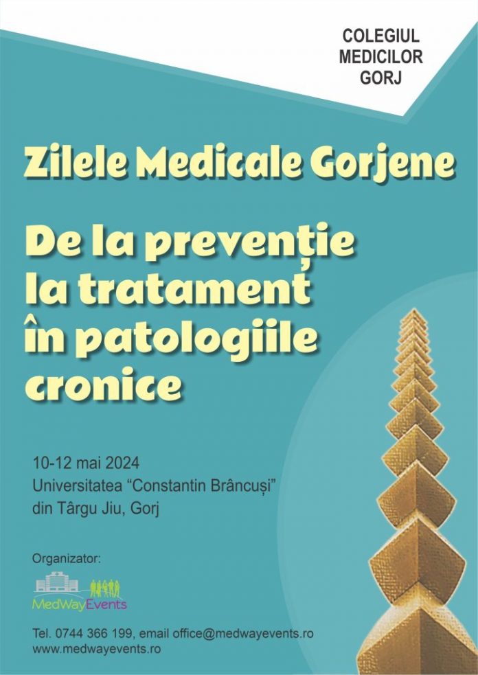 Colegiul Medicilor Gorj, împreună cu MedWay Events, organizează cea de-a treia ediție a simpozionului interdisciplinar „Zilele Medicale Gorjene – De la prevenție la tratament în patologiile cronice”, ce se va desfășura la Târgu Jiu, în perioada 10-12 mai 2024.