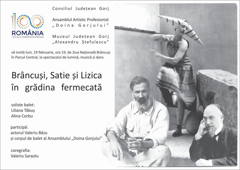 ”Ziua Brâncuși” va fi celebrată la Târgu-Jiu printr-un spectacol de lumină, muzică și dans, „Brâncuși, Satie și Lizica în grădina fermecată”, care va avea loc luni, 19 februarie 2018, începând cu ora 19.00, în Parcul Central din Municipiul Târgu-Jiu.