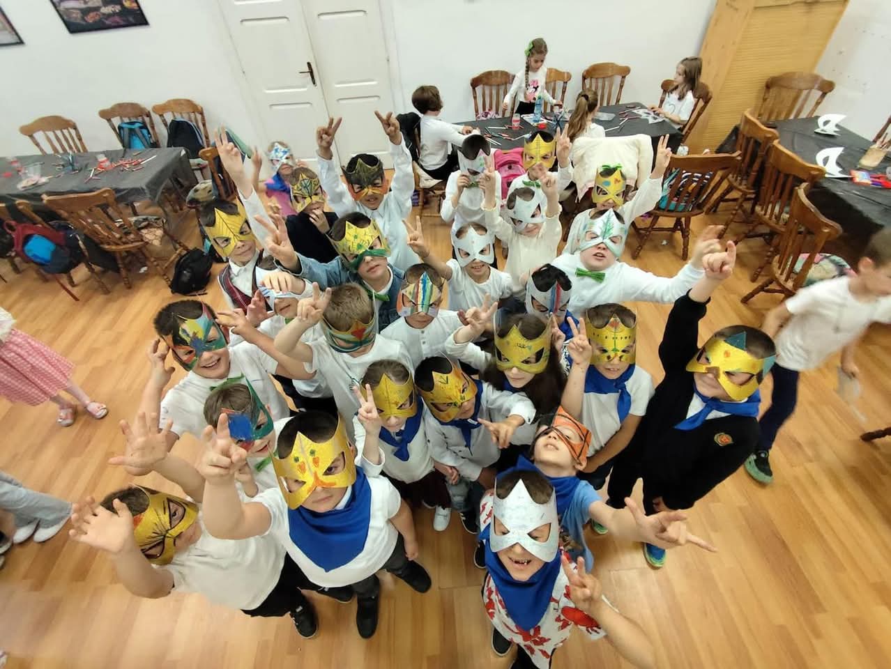 La final, micii artiști au plecat acasă cu măștile realizate de ei, precum și cu daruri pentru suflet și imaginație: caiete de desen, culori și baloane colorate!