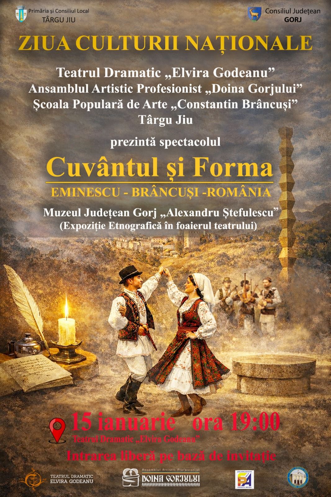 Pe 15 ianuarie, de Ziua Culturii Naționale, Teatrul Dramatic „Elvira Godeanu” Târgu Jiu găzduiește un eveniment special dedicat identității și valorilor românești: spectacolul „Cuvântul și Forma. Eminescu – Brâncuși – România”.
