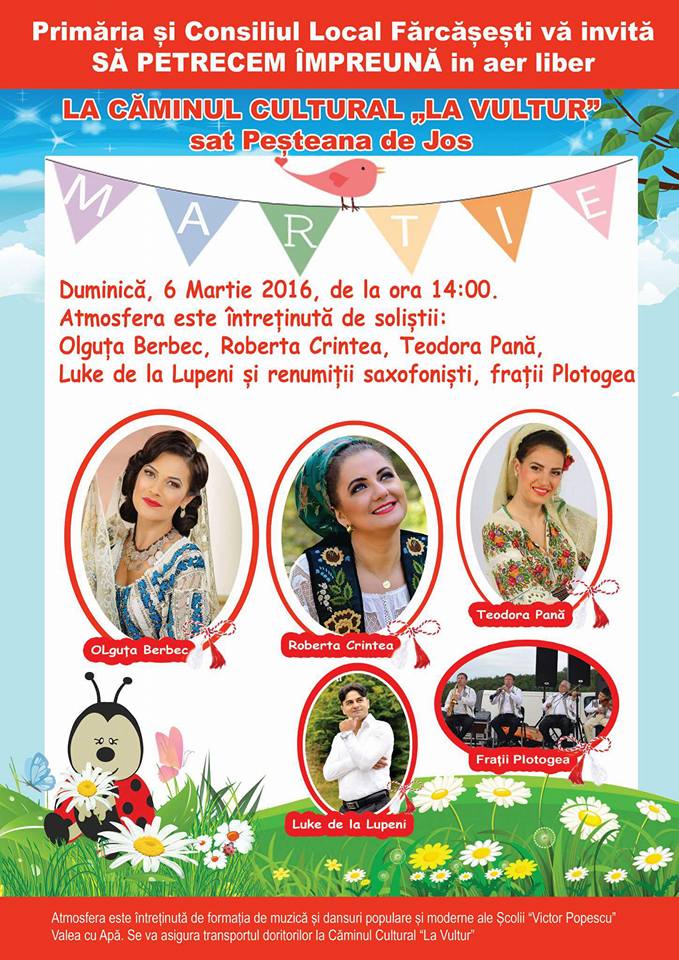 Ca de fiecare dată, primarul comunei Fărcășești, Dănuț Bălu, le organizează doamnelor o petrecere de pomină, mai ales că va candida din partea PSD pentru încă un mandat de edil. Pe scenă vor urca: Olguța Berbec, Roberta Crintea, Teodora Pană, frații Plotogea, Luke de la Lupeni, dar și mulți alții. Evenimentul va avea loc pe 6 martie, de la ora 14.00, la Căminul Cultural.