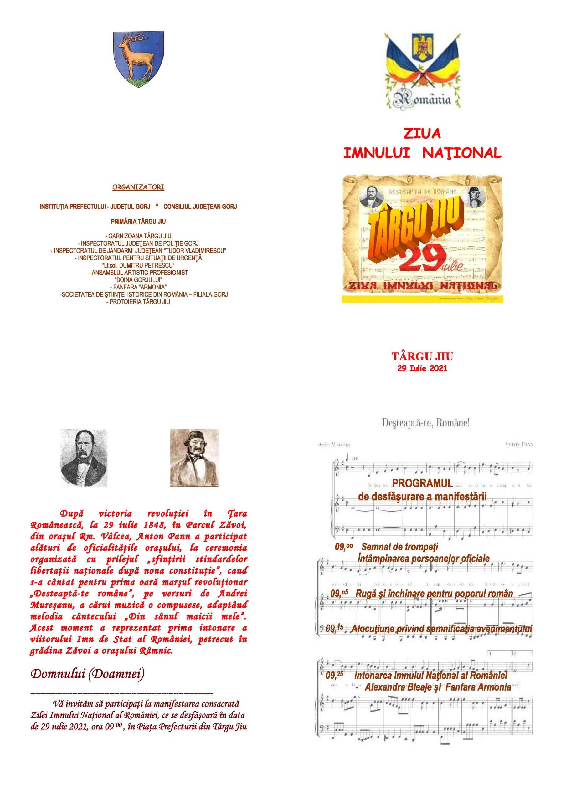 Ziua imnului naţional al României – Deşteaptă-te române!, simbol al unităţii Revoluţiei Române de la 1848, va fi marcată joi, 29 iulie, la Târgu-Jiu, de reprezentanții autorităților județene și locale.