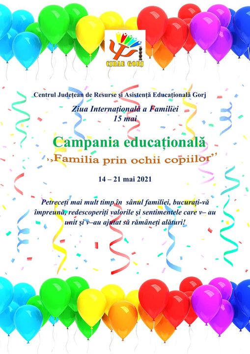 Centrul Județean de Resurse și Asistență Educațională Gorj va marca Ziua Internațională a Familiei printr-o serie de activități ce se vor desfășura în perioada 14-21 mai. ”Dorind să marcheze această zi, CJRAE Gorj a conceput o serie de activităţi care se vor desfăşura în perioada 14 – 21 mai, menite să conştientizeze participanţii cu privire la valorile familiei, la necesitatea creşterii într–un mediu familial sănătos, la importanţa şi valoarea familiei contemporane. Cu ocazia acestui eveniment, echipa C.J.R.A.E. Gorj va desfăşura campania ”Familia prin ochii copiilor” care are ca scop dezvoltarea unor relaţii de familie sănătoase şi armonioase, combaterea violenţei în familie, promovarea dragostei, respectului, echităţii în asumarea responsabilităţilor ca valori supreme care stau la baza familiei”, au anunțat reprezentanții CJRAE Gorj.