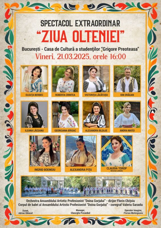 Ziua Olteniei, spectacol extraordinar la București! Ziua Olteniei este sărbătorită astăzi și la București, artiști îndrăgiți ai Ansamblului ”Doina Gorjului” susținând un spectacol extraordinar la Casa Studenților ”Grigore Preoteasa” din Capitală, spre bucuria oltenilor care au venit la spectacol. Acolo este și istoricul Gheorghe Nichifor, consilier al președintelui Consiliului Județean Gorj, vorbind pe scenă despre însemnătatea acestei zile. Spectacolul deosebit dedicat tuturor oltenilor a fost organizat de Liga Fiii Gorjului, al cărei președinte este ing.Sabin Stamatescu, care a avut câteva cuvinte pentru olteni, pe scena Căminului Studențesc. Sub egida Ligii ”Fiii Gorjului” au avut loc, de-a lungul timpului, mai multe spectacole și concerte, acțiuni culturale foarte importante în comunitate, organizate pentru ca tradițiile gorjenești, oltenești, să fie duse mai departe.