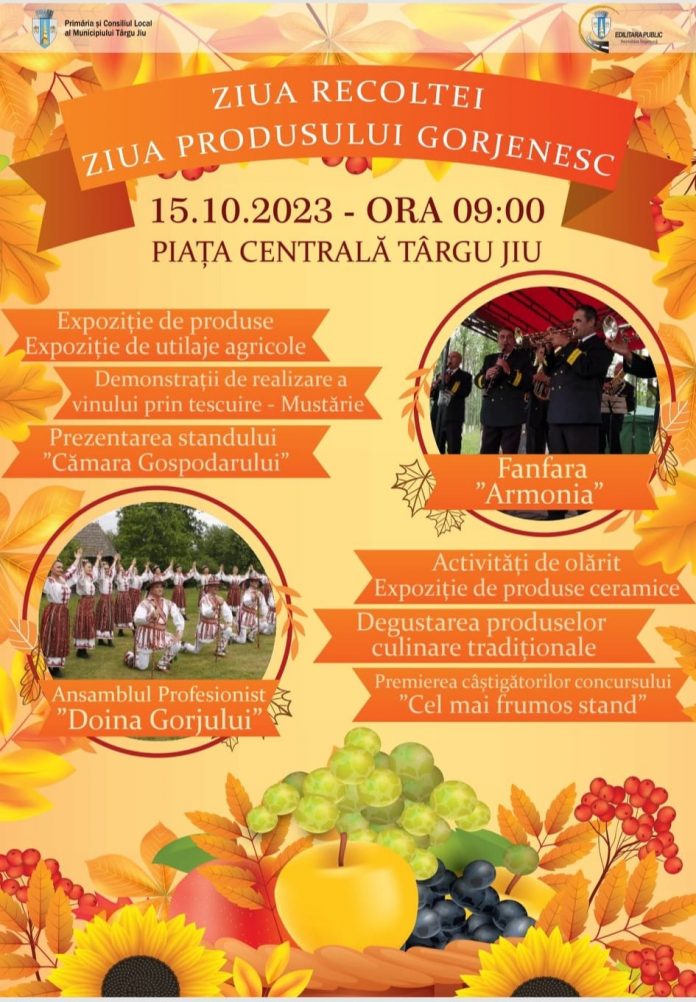 Primăria Municipiului Târgu-Jiu și Edilitara Public, în parteneriat cu Direcția pentru Agricultură Județeană Gorj, vă invită duminică, 15 octombrie 2023, începând cu ora 09:00, în Piața Centrală din Târgu-Jiu, la „Ziua recoltei, Ziua produsului gorjenesc”.