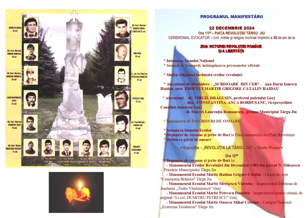 Ziua Victoriei Revoluţiei Române şi a Libertăţii este marcată în fiecare an la data de 22 decembrie. În Piața Prefecturii din Târgu Jiu, cu începere de la ora 11.00, are loc un ceremonial evocator – civil, militar și religios închinat împlinirii a 35 de ani de la căderea comunismului în România.
